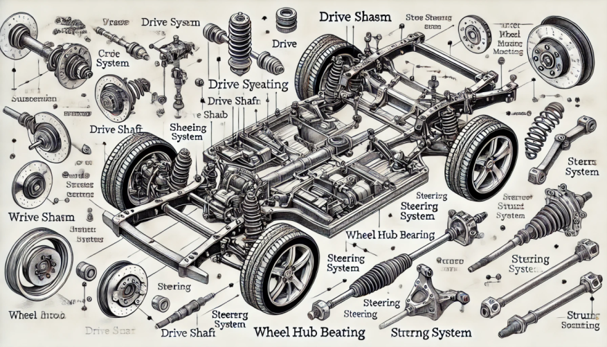This diagram highlights critical parts of a car chassis, including the suspension system, drive shaft, wheel hub bearing, steering system, and strut mounting. Each component plays a vital role in vehicle control, stability, and overall performance.